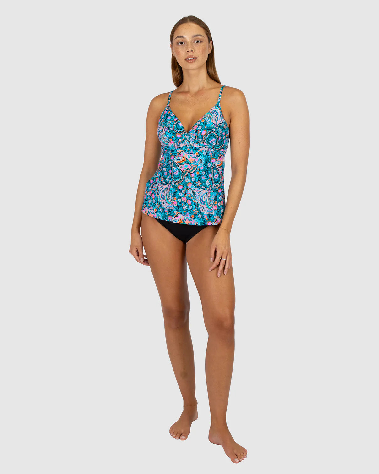 Baku's South Beach Multi Fit Wrap Singlet. Featuring soft moulded fixed cups and wrap details, it ensures a comfortable and flattering fit. With an adjustable straps and multi A-D cup fit. Dive into the free-spirited elegance of South Beach with its captivating paisley motif. Inspired by boho-chic vibes, this luxurious design weaves intricate paisley patterns, infusing each curve with a tapestry of mesmerising allure.