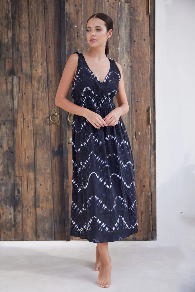 The neck-defining Stefia midi dress in linen features a long V-neckline, with very flattering shirred detail under the bust and at the back neckline as well. The thin straps have elastic at the back, making this such a great dress to throw on. Two side slits add a sultry touch to this ultra femme dress.