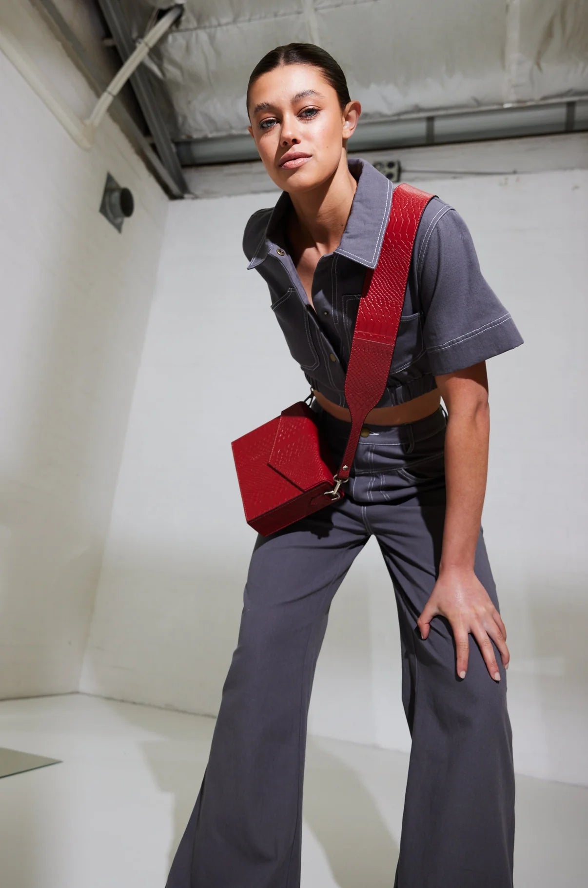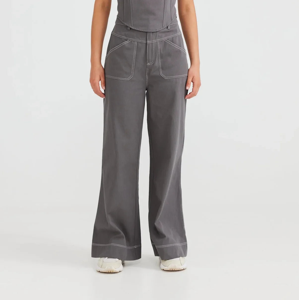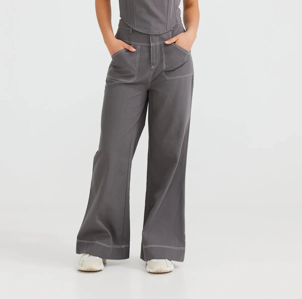 - Fitted through hips with a wide leg opening