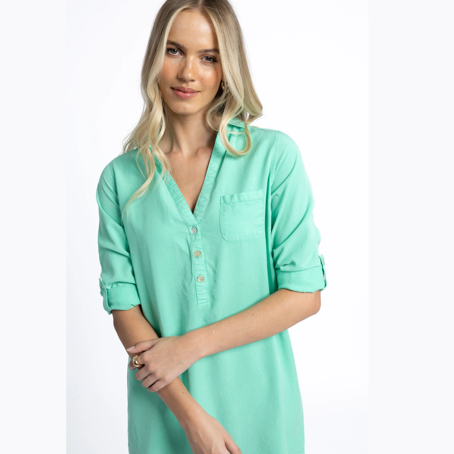 - Full-length sleeves with split and button at cuff - roll the sleeves up and secure with tab and button or wear down.