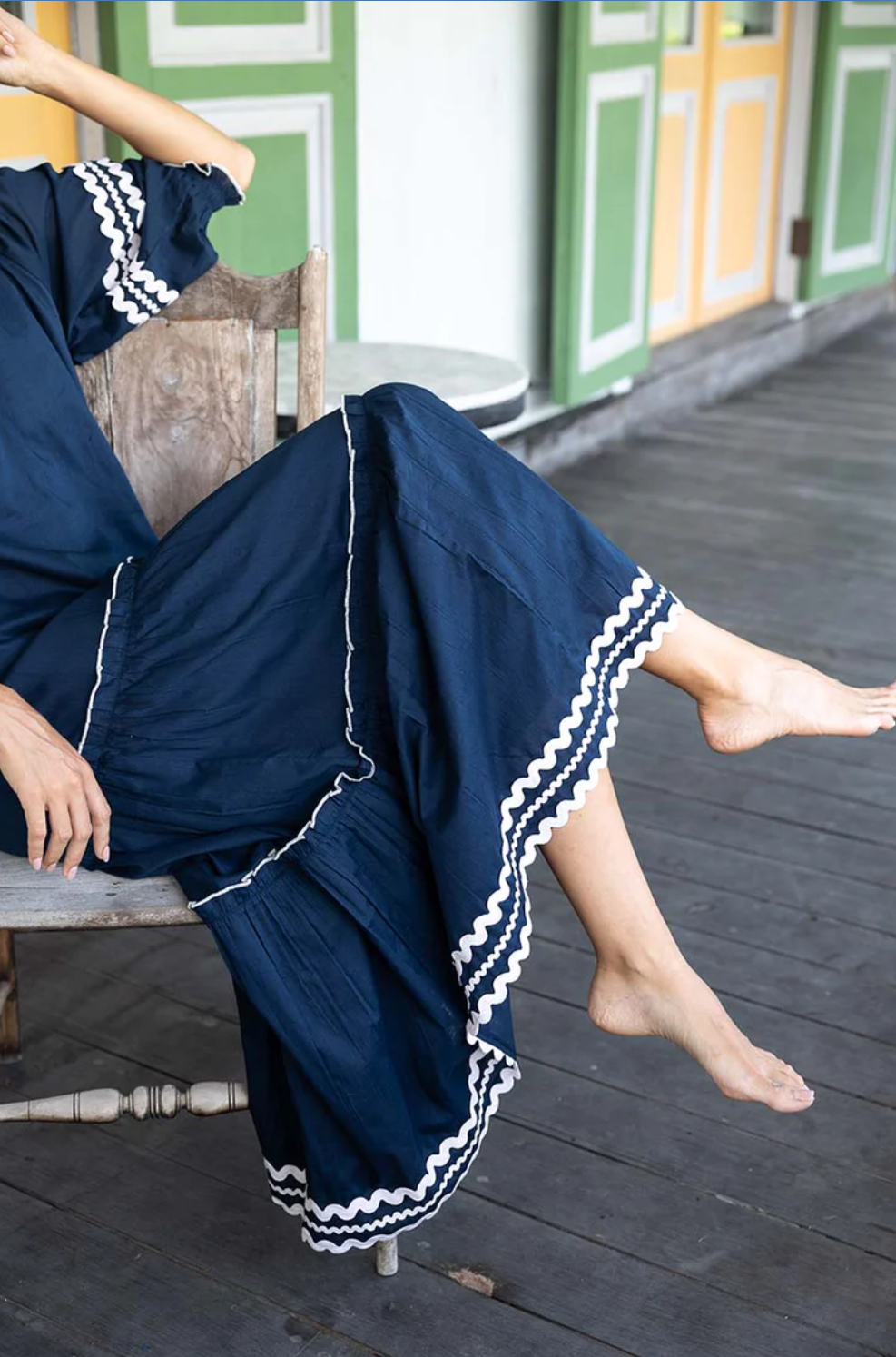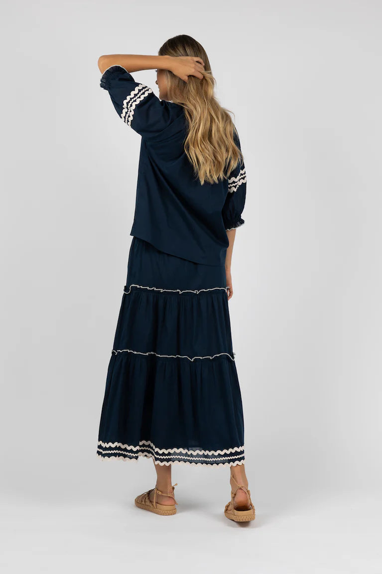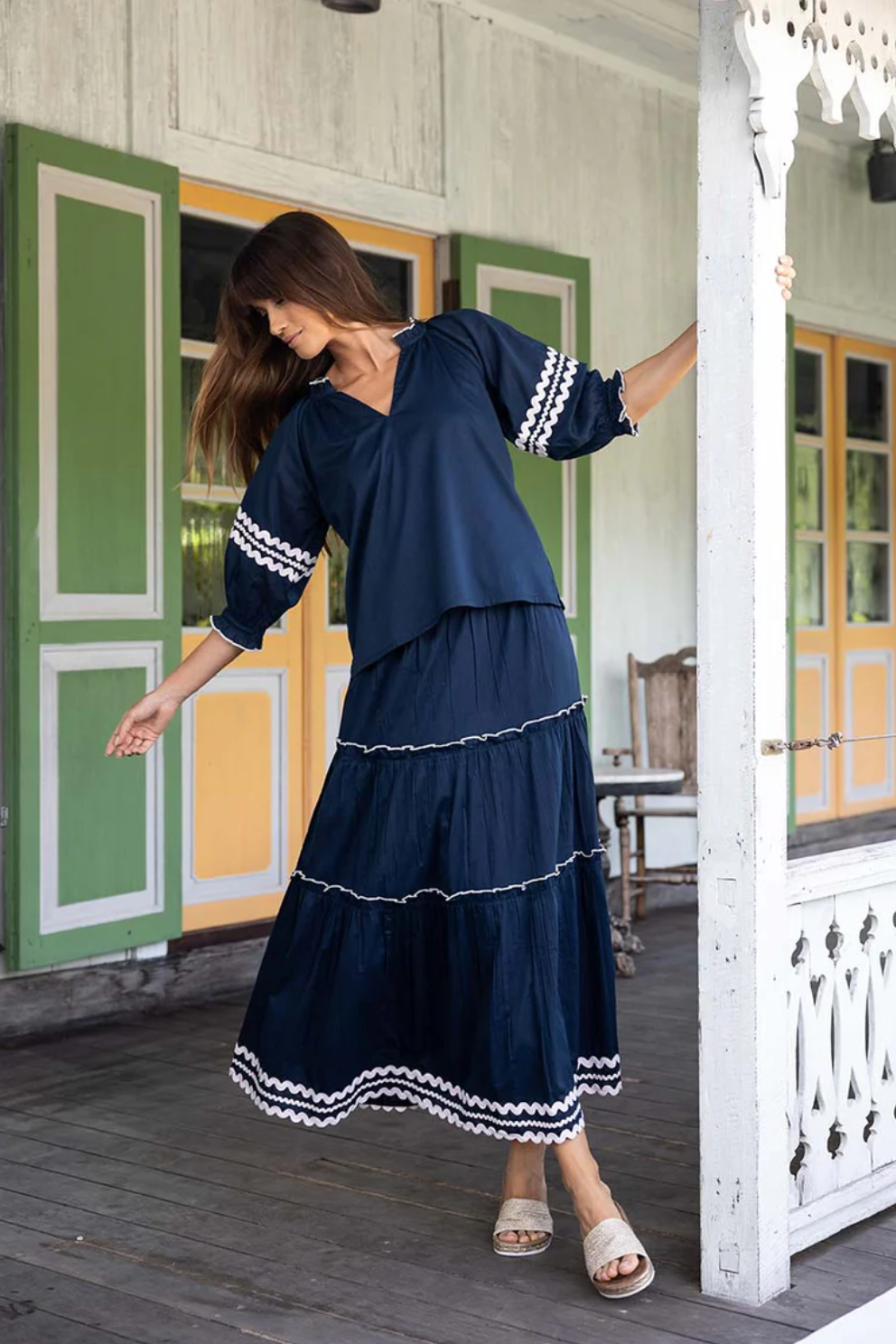 Embrace summer with the Ziggy Skirt, a pretty, flowy piece designed for comfort and style. Featuring shirring detail at the elasticized waist for a flattering fit, this skirt is made from 100% lightweight cotton voile and is maternity-friendly. The upward-facing frill on the tiers and zigzag trimming on the hem add a playful touch. Sitting just above the ankle on average height.