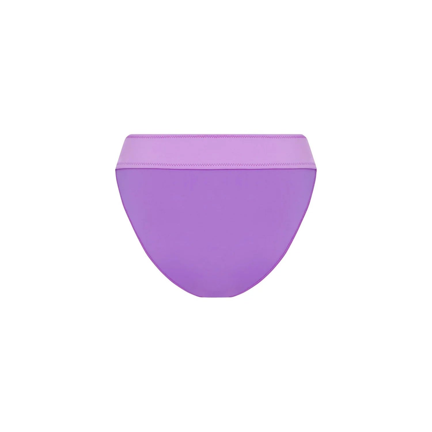 The Contour Bikini Pant in Periwinkle boasts vibrant purple colour-blocks. Crafted from strong-hold compression lycra, it features a supportive waistband and a flattering high-cut leg.