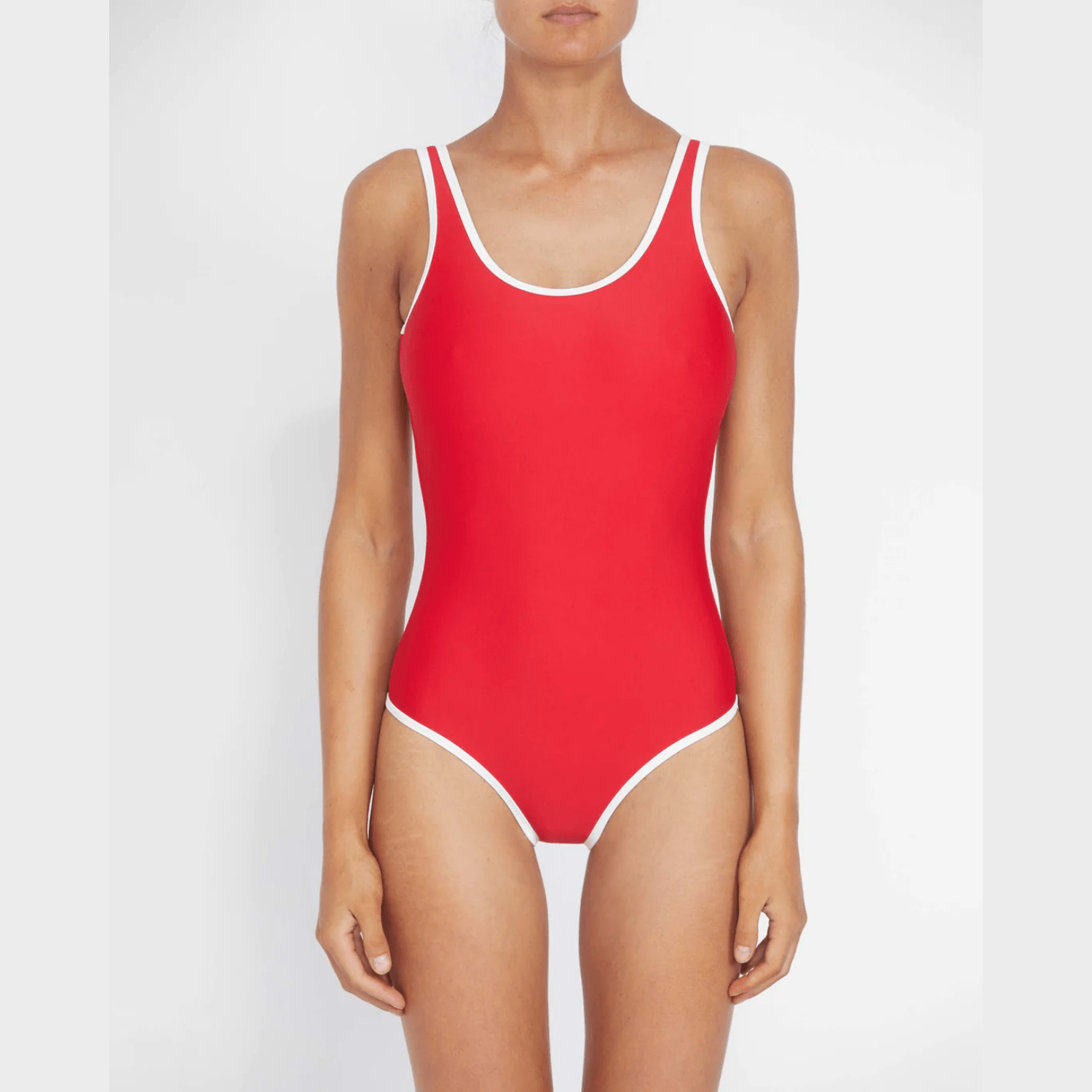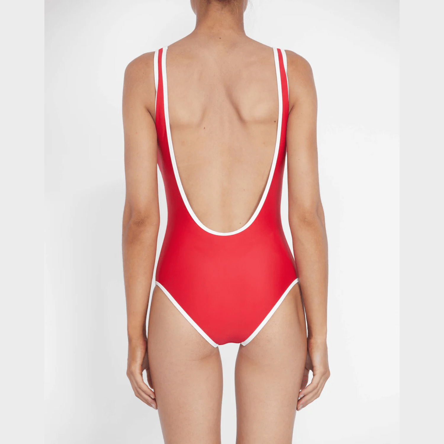 Our ultra-flattering one-piece features a low scoop back with just the right amount of coverage. Designed with a built-in-bra shelf for extra support and a mid-high cut leg. Double lined in luxurious matte black fabric with contrasting white bound edges.