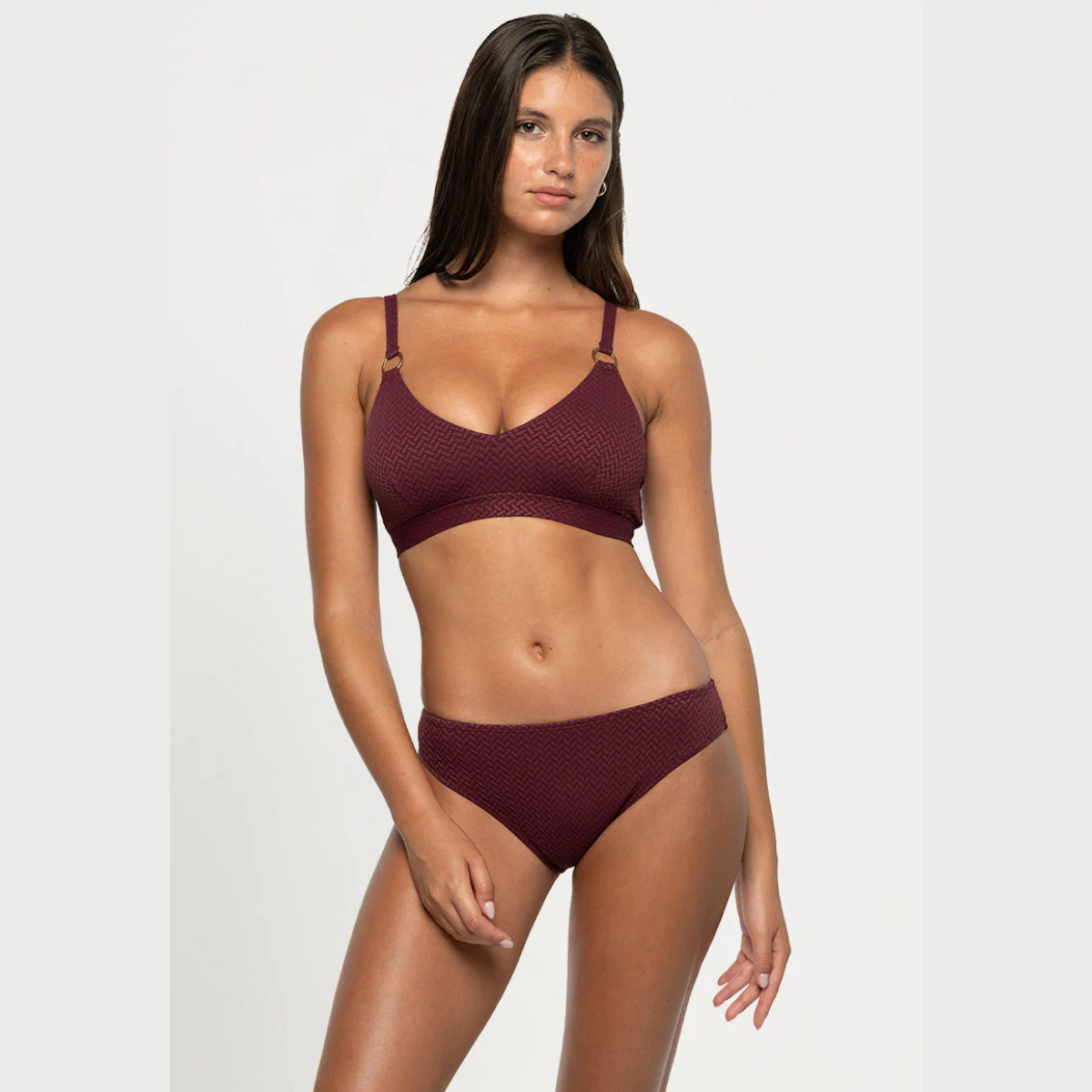 Strap feature trim This bikini top has a matt dyed to match square ring on each front shoulder strap creating a luxe appeal.