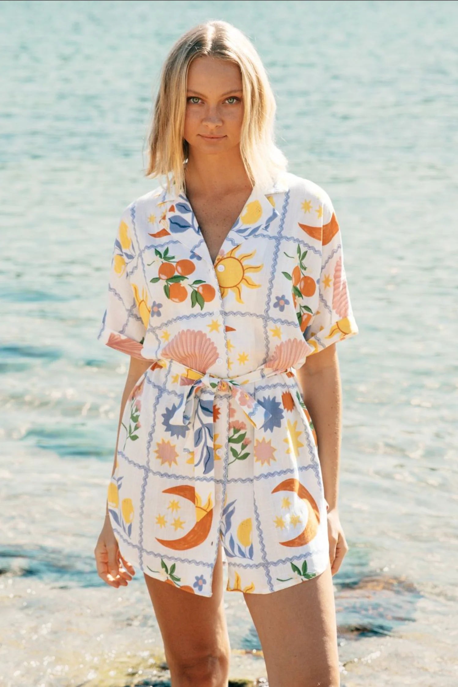 Get ready to rock your summer in our Costa Rico Shirt Dress! With its playful summertime print and figure-flattering waist tie, this lightweight dress will keep you cool and stylish. Don't miss out on this must-have piece for your wardrobe!