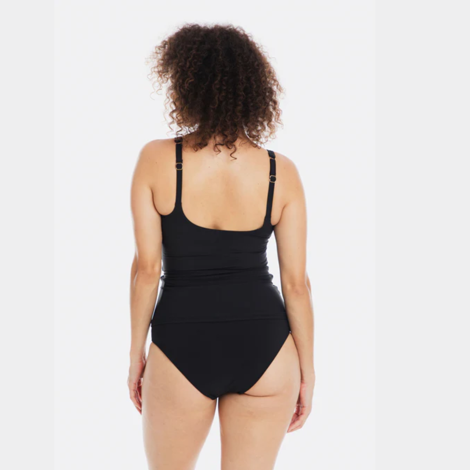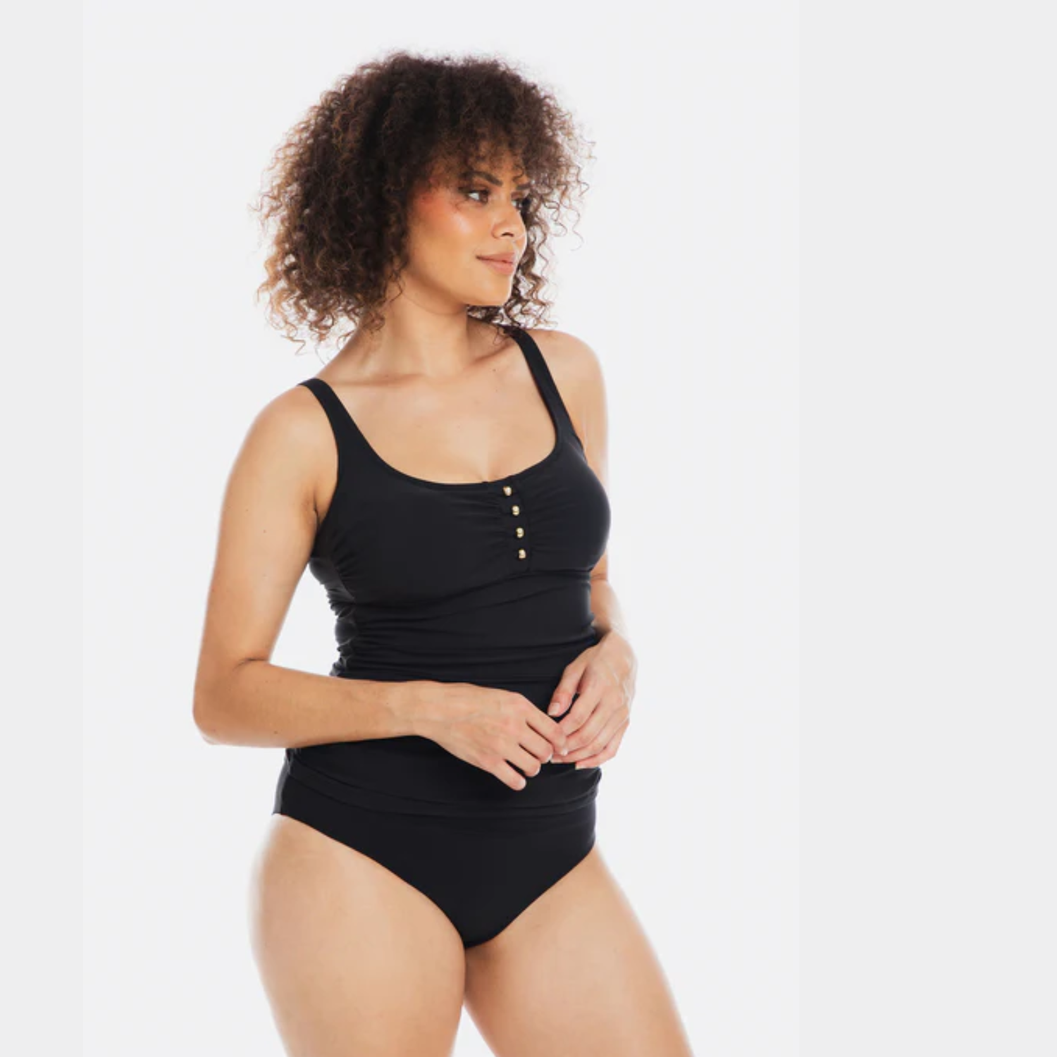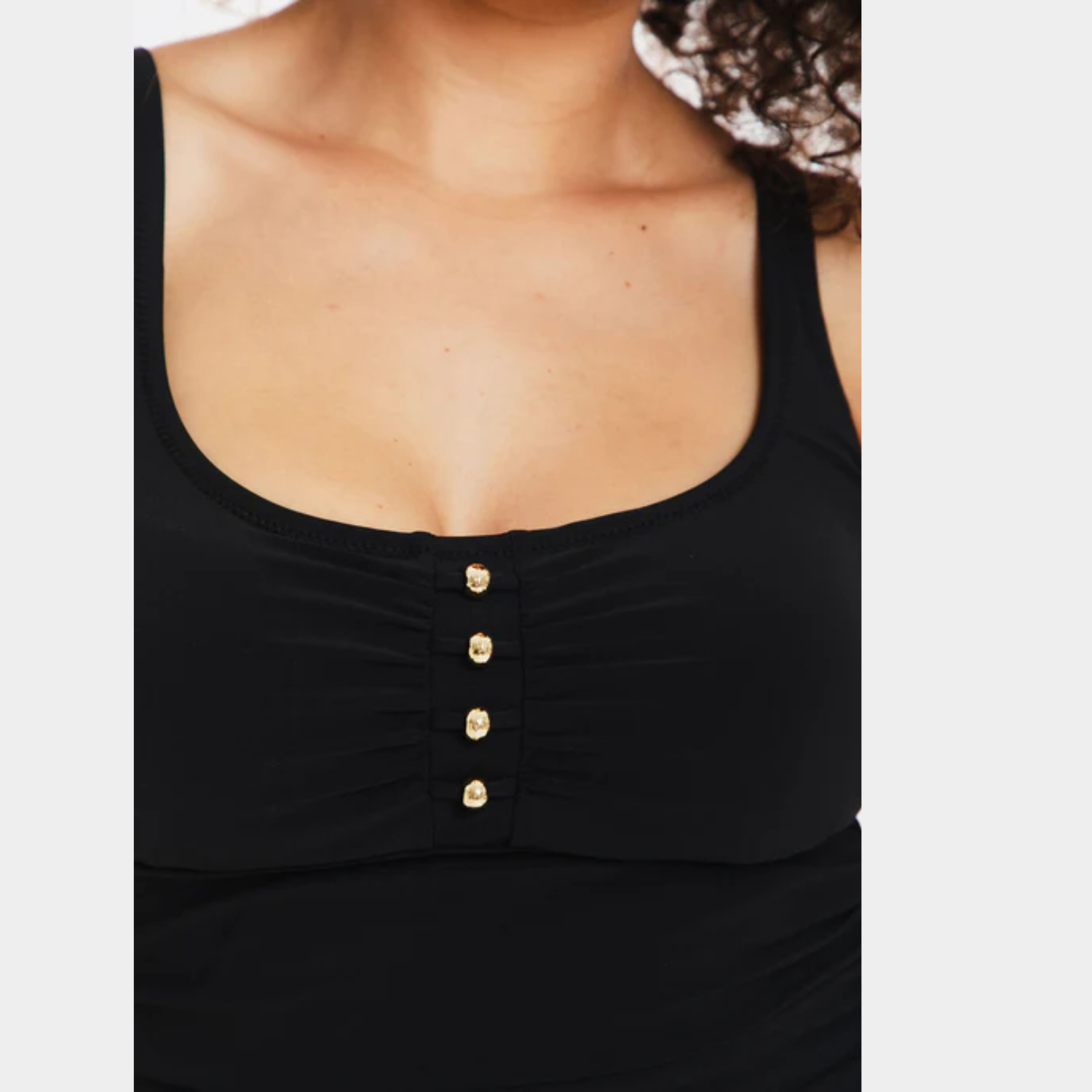 Introducing the versatile elegance of our Black Microfibre Tankini Underwire, featuring a chic rounded-square neckline and refined gold button detailing at the bust. Thoughtfully designed with subtle ruching at the tummy for a slimming effect.
