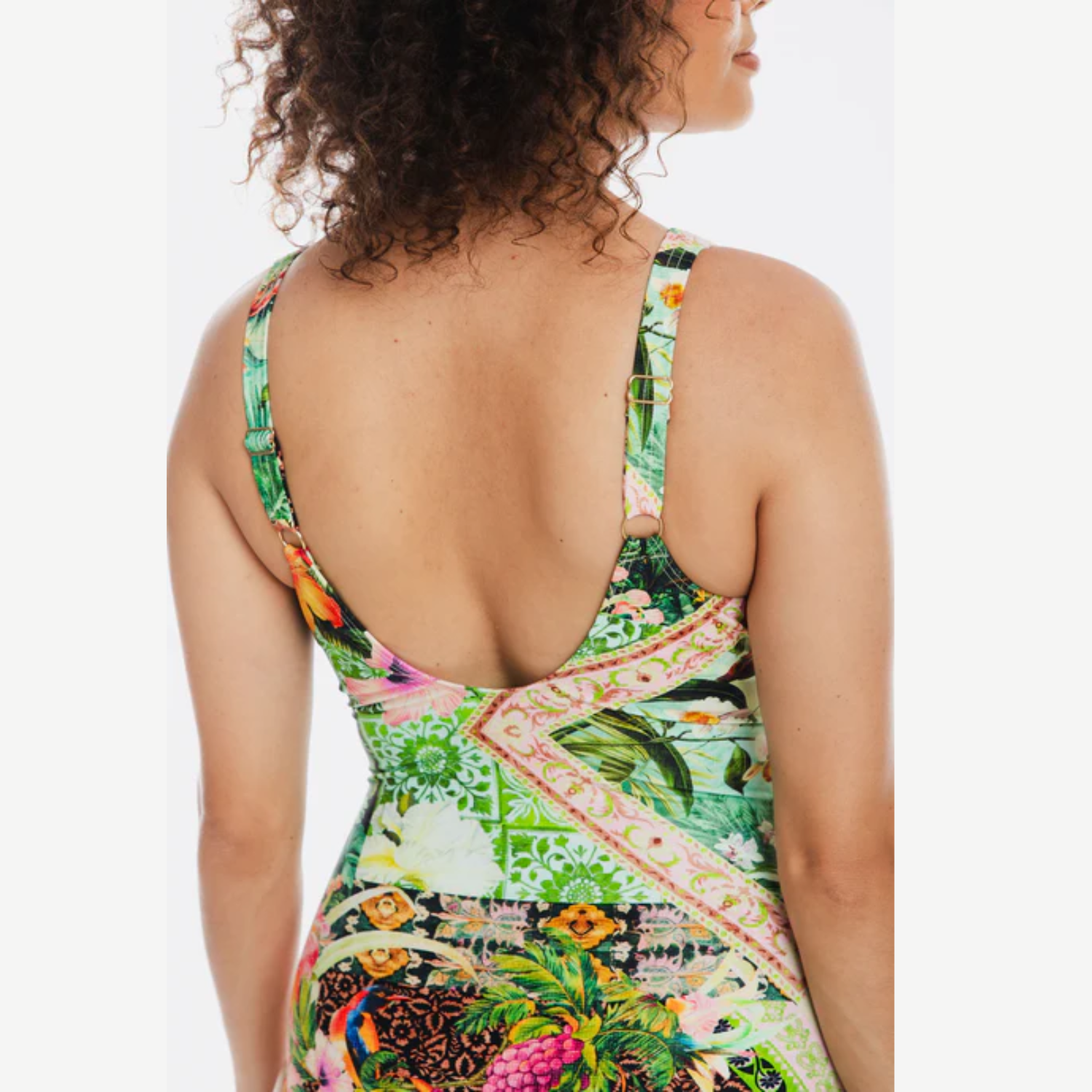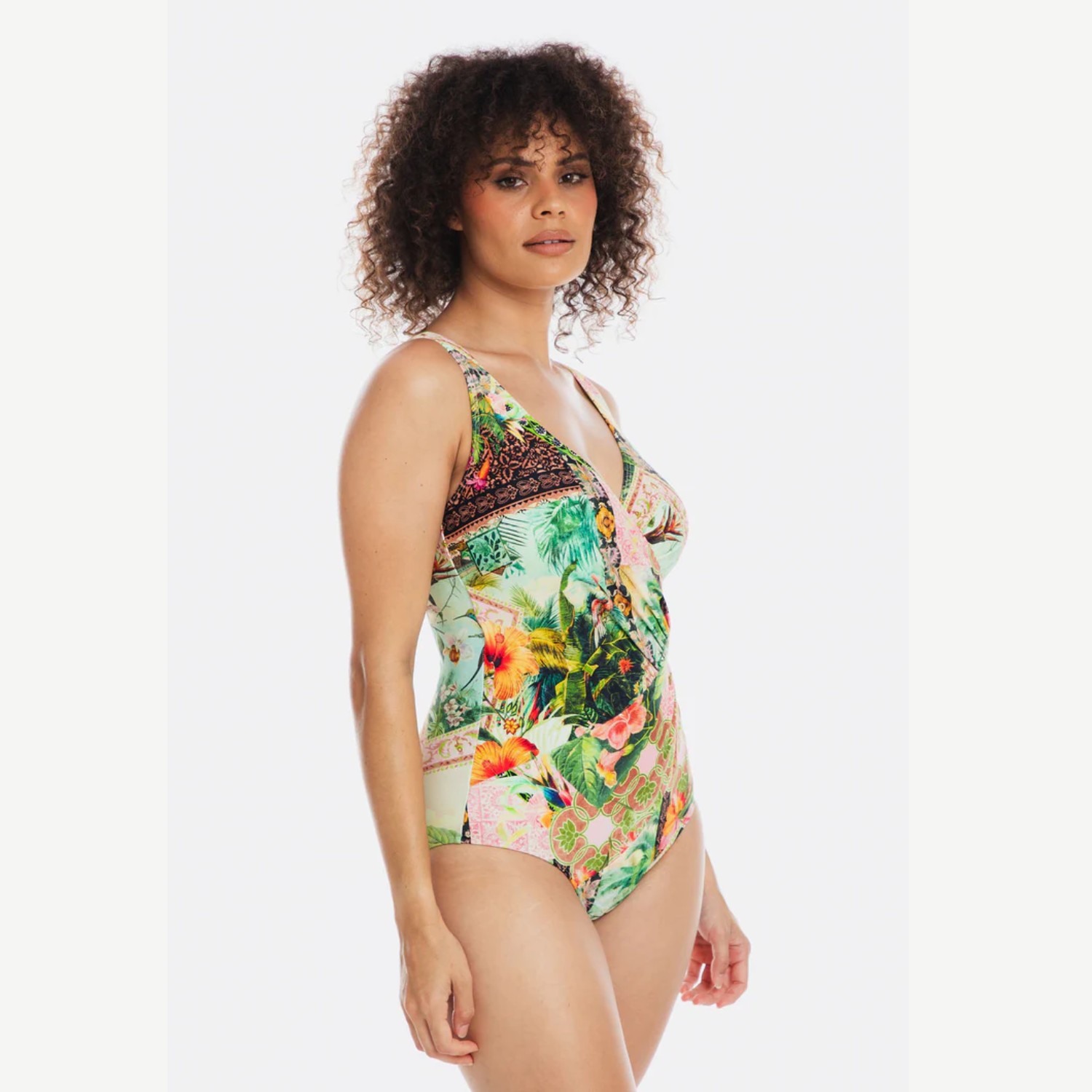 Introducing the Togs classic crossover one-piece swimsuit. This elegant swimsuit features 3-way ruching, creating a flattering silhouette that enhances your natural curves. Designed with wire-free support, it offers both comfort and freedom of movement, making it perfect for any water activity.