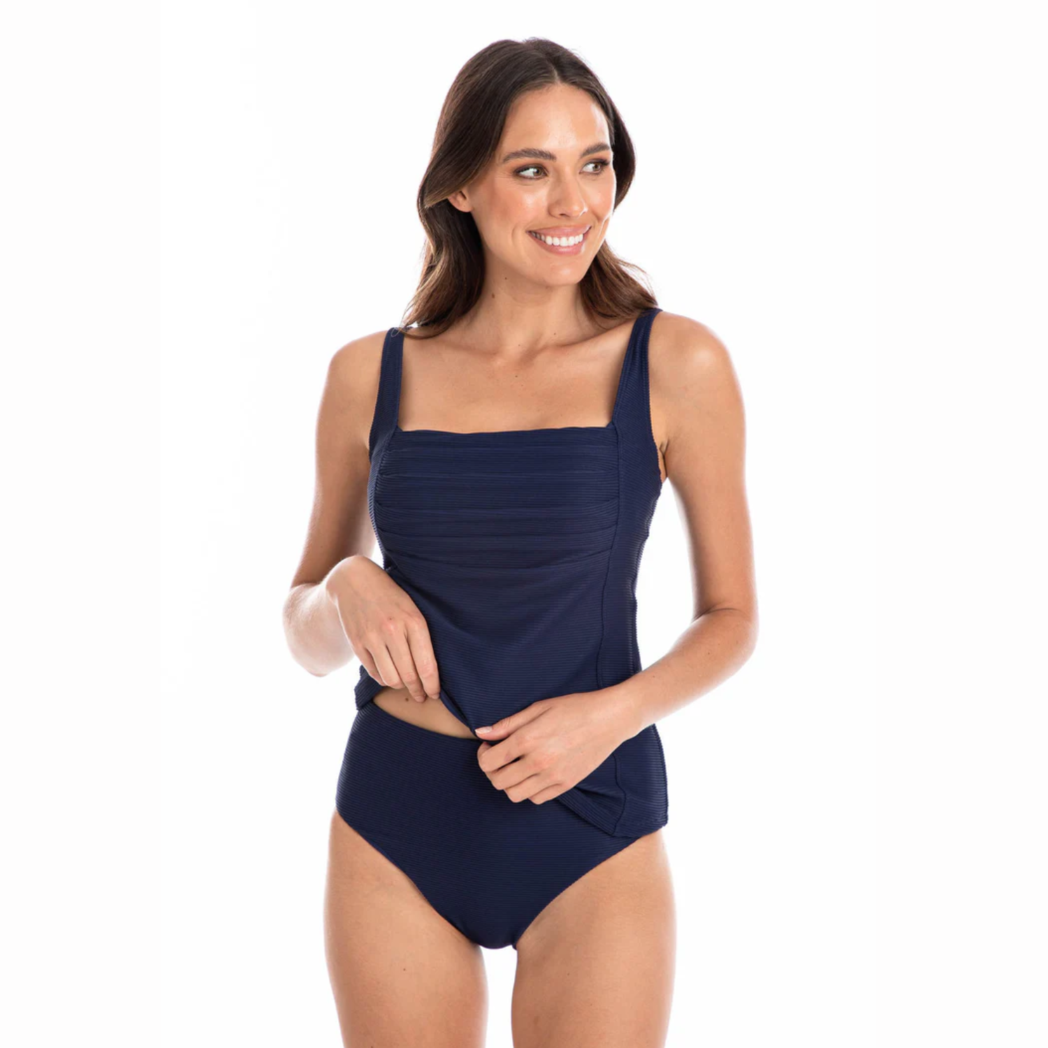 Enjoy the versatility of our tankini top featuring a stylish square neckline and elegant pleating detail on the bust. This tankini swimsuit provides both coverage and support for a comfortable and confident beach or poolside experience.